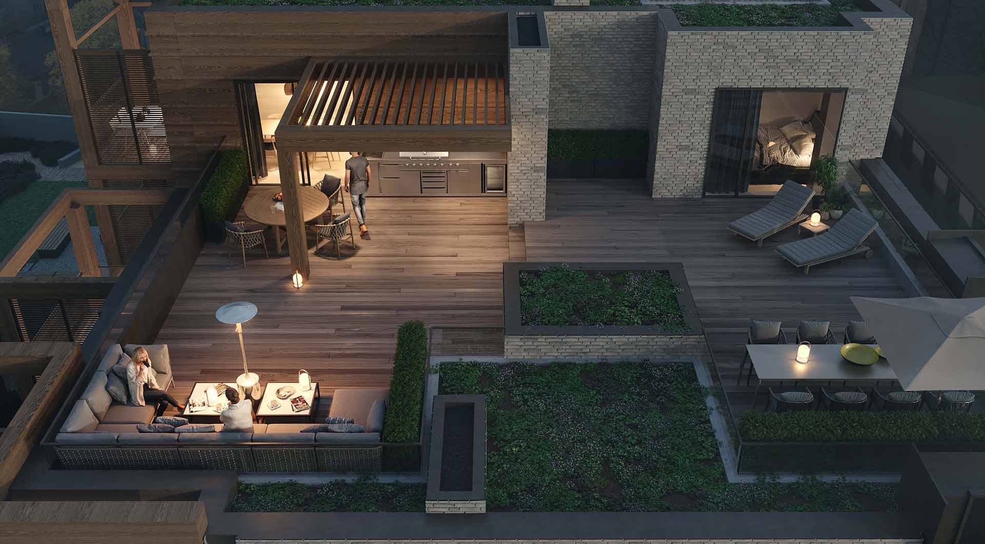 Samtlige leiligheter i Fredensborgveien 24 får privat terrasse eller balkong med plass til både krydderurter, reddiker og tomatplanter. Størrelsen varierer fra 5 til 13 kvadratmeter. Beboerne i toppleilighetene kan nyte takterrasser på over 90 kvadratmeter, med blant annet pergola og utekjøkken. Her kan grønnsakene tilberedes direkte etter høsting. Noen leiligheter får en heldekkende foldevegg av glass mot balkongen. Veggen kan åpnes fullstendig, slik at terrassegulvet går i ett med parkettgulvet. Dermed blir balkongen og kjøkkenhagen en forlengelse av stuen.