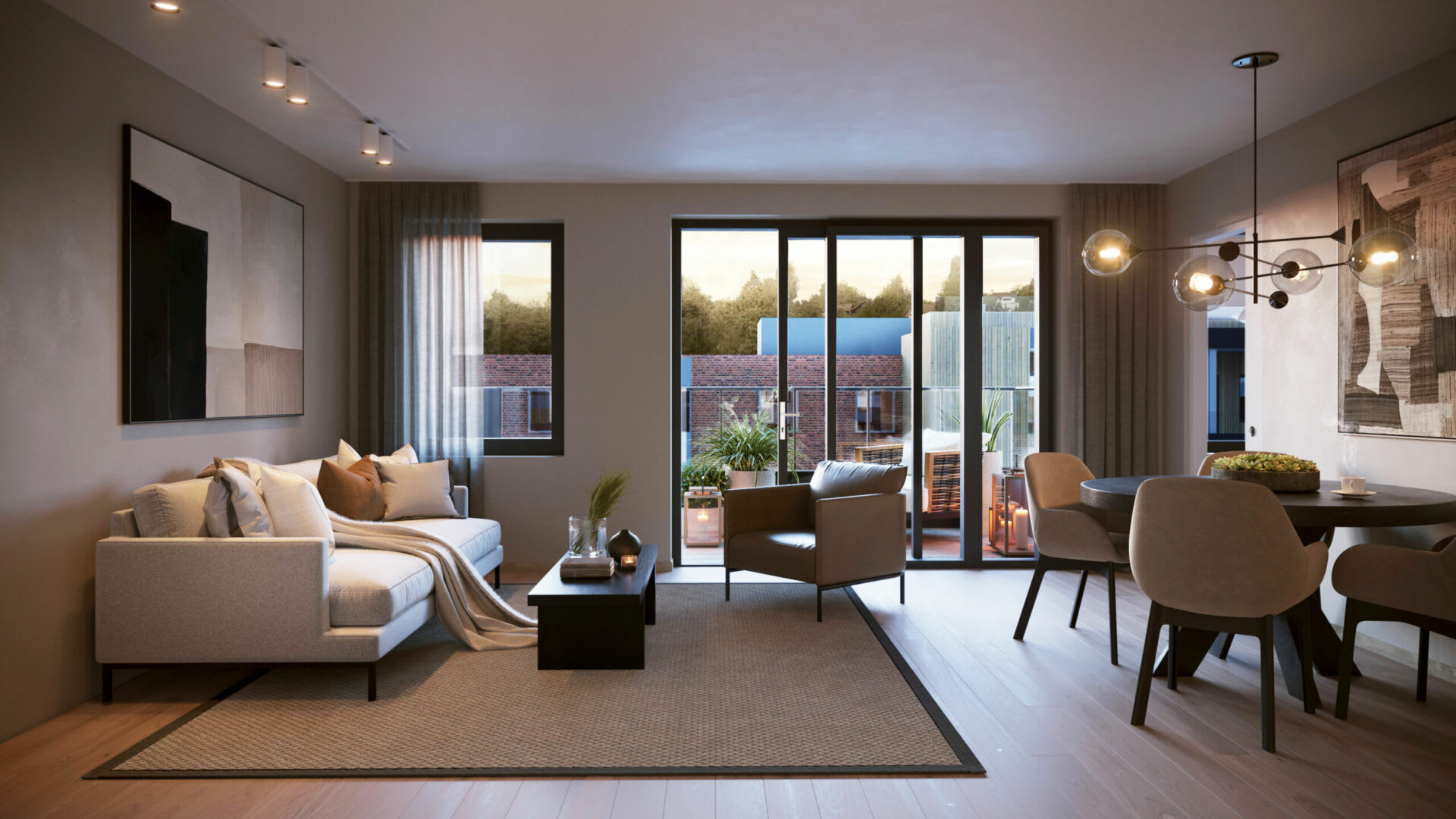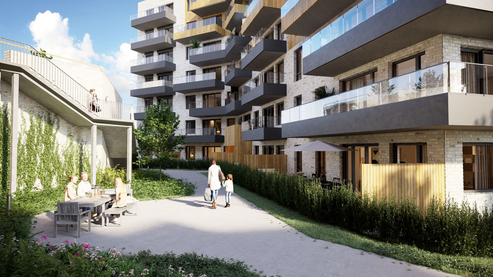 Byggene får spennende fasader med en kombinasjon av lyst treverk og lys teglstein. Balkongrekkverkene i aluminium og glass er utformet slik at de gir et eksklusivt uttrykk til byggets arkitektur. De har en nedre del som er tett for å gi privatliv og en øvre del i glass som slipper inn lys og gir utsyn.