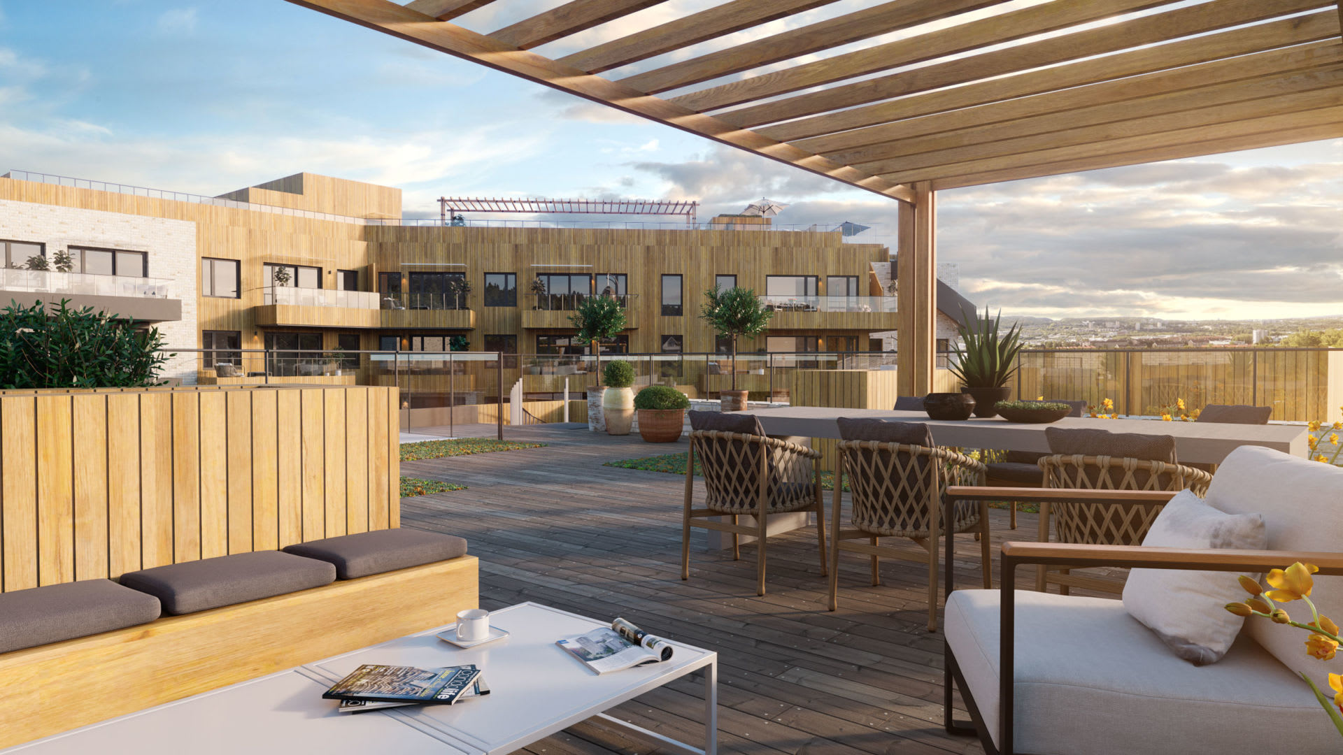 Ammerud Stasjon får store felles takterrasser med sittegrupper, pergolaer og beplantning. Takterrassene blir en fin møteplass for alle beboere, hvor man kan nyte fantastisk utsikt og sol fra morgen til kveld.
