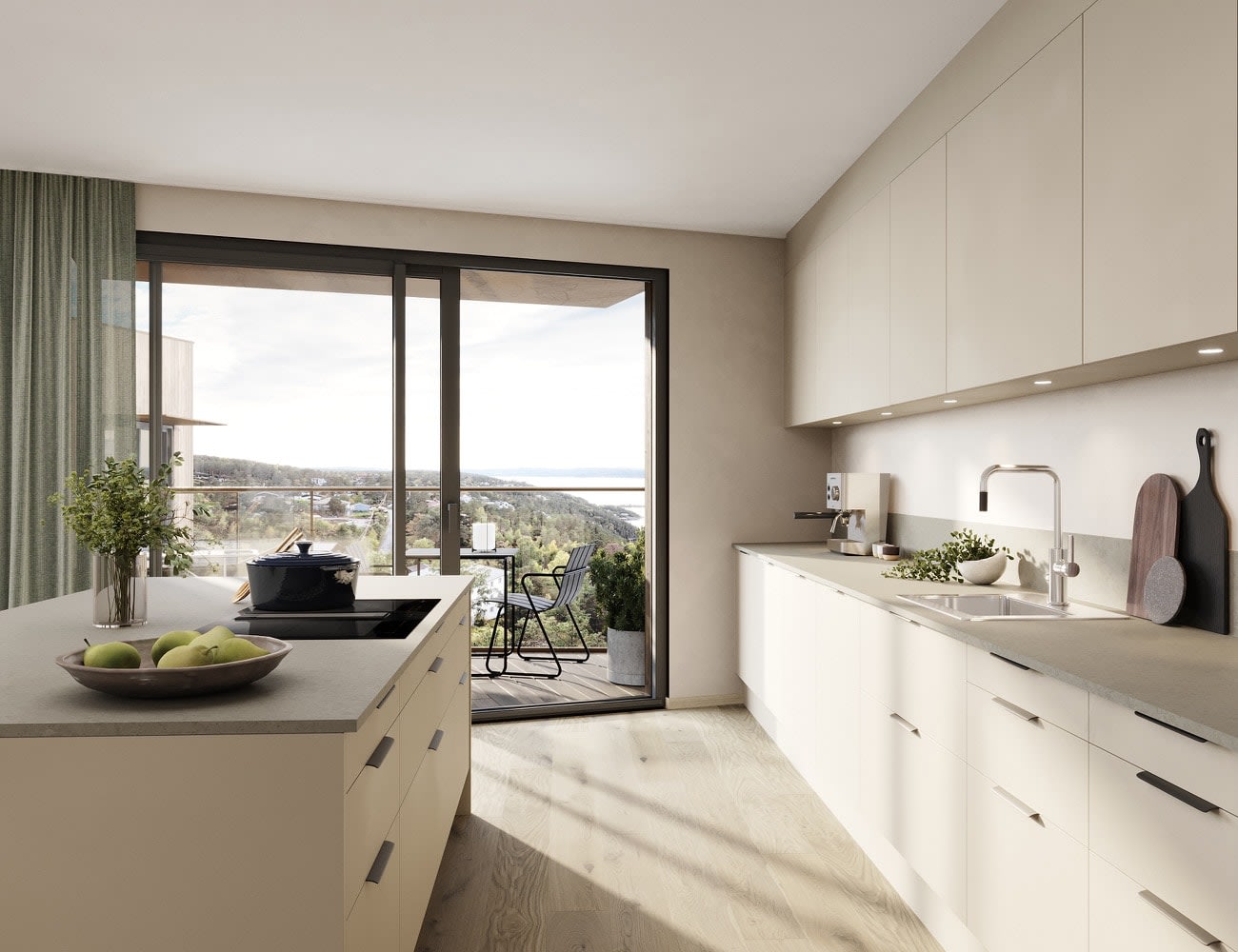 Kjøkken vil bli levert i fargen Korn, en delikat beigetone som skaper en rolig atmosfære du vil trives i. Benkeplate i en mørkere jordtone.