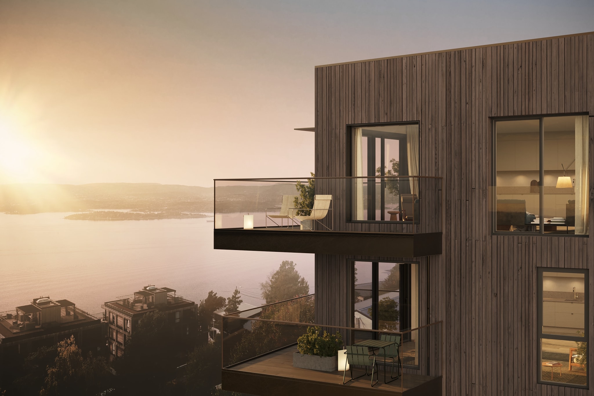 Fasadeutformingen av prosjektet er heller ikke lagt til tilfeldighetene, det er sørget for at hver enkelt leilighet med sine store vindusflater skal få best mulig utsikt, sollys og dagslys inn i leiligheten og på uteplassen.
