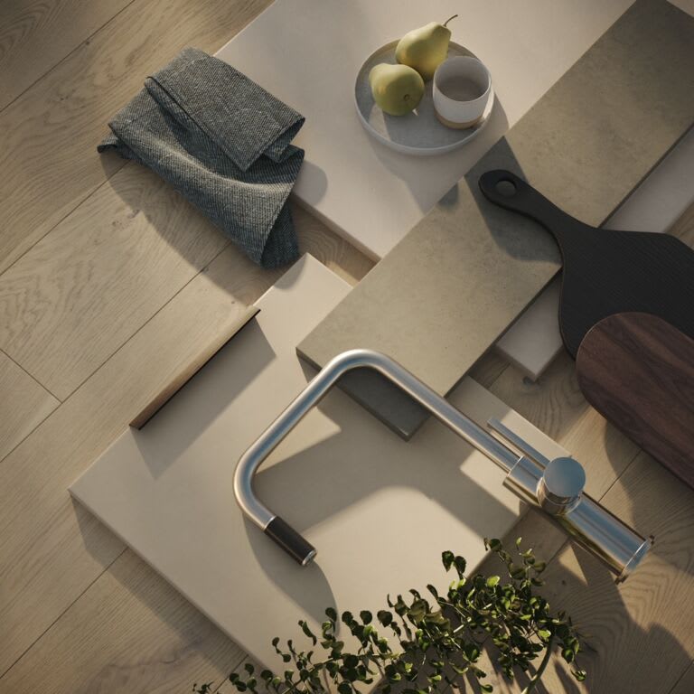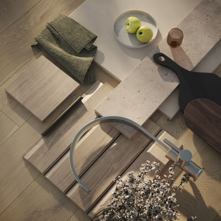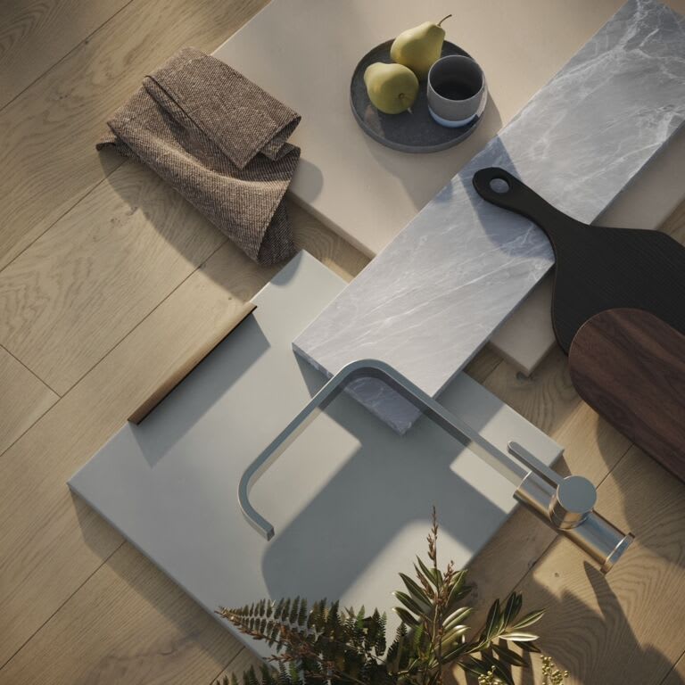 I dette konseptet står naturlige fargetoner og den nordiske stilen sentralt. Kjøkken i lys slett eik i kombinasjon med solide eikelameller med benkeplate i sandsten laminat. Diskret håndtak i antrasitt, armatur og øvrige detaljer i krom, som sammen holder fast ved den nordiske stilen.