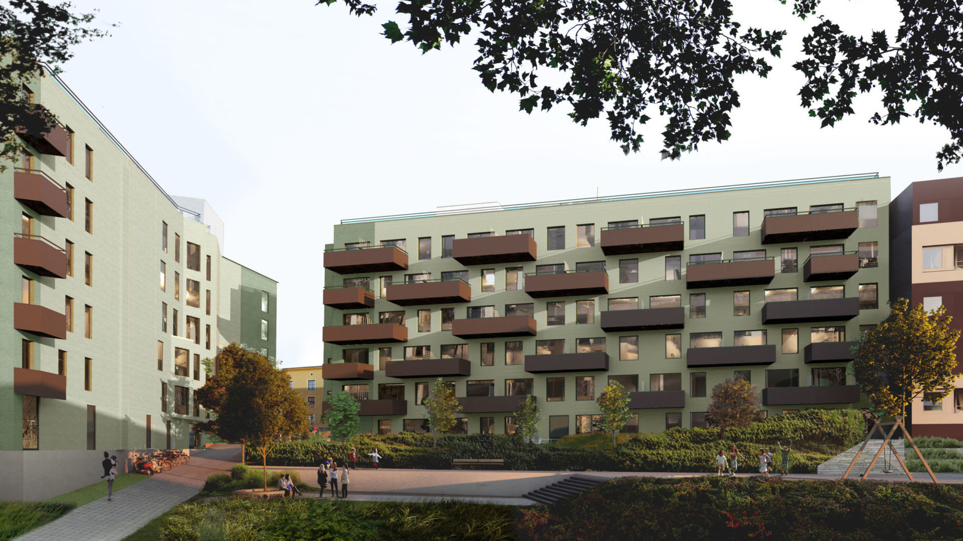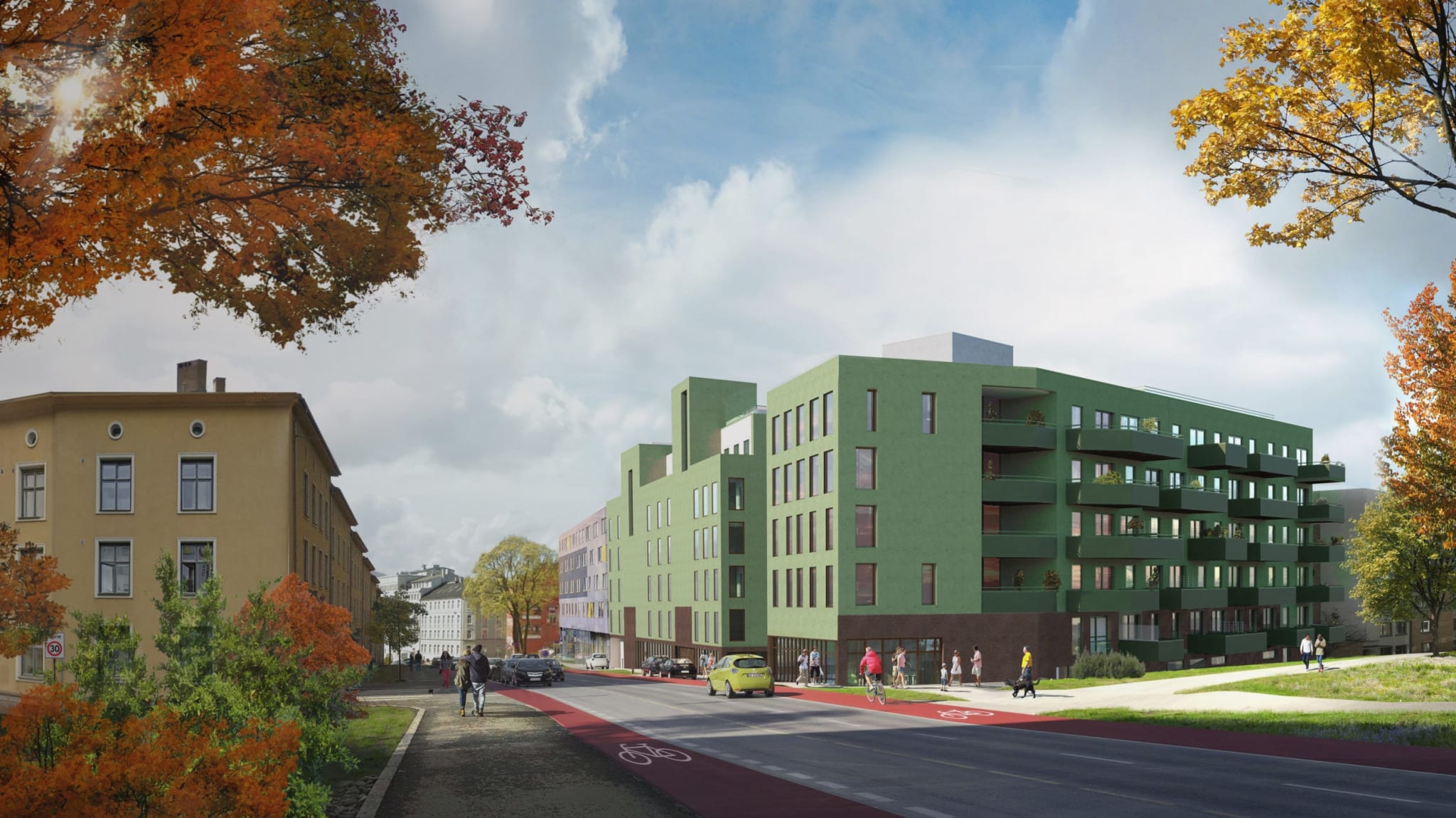 Dagens næringsbygg er planlagte erstattet med leiligheter. Det er lagt vekt på å få til et godt bomiljø i moderne byleiligheter. Konseptet kalles «Byen i flere nivåer». Byen i flere nivåer handler om å møte de eksisterende bebyggelse med respekt gjennom å bruke eksisterende høyder og skala som en designparameter. Vi bygger lameller i ulike høyder med takhager. Bakhagen utvikles i 3 høyder knyttet med trapp og ramper. Butikk får inngang fra bakkeplan, og utvides i nedre etasjen.