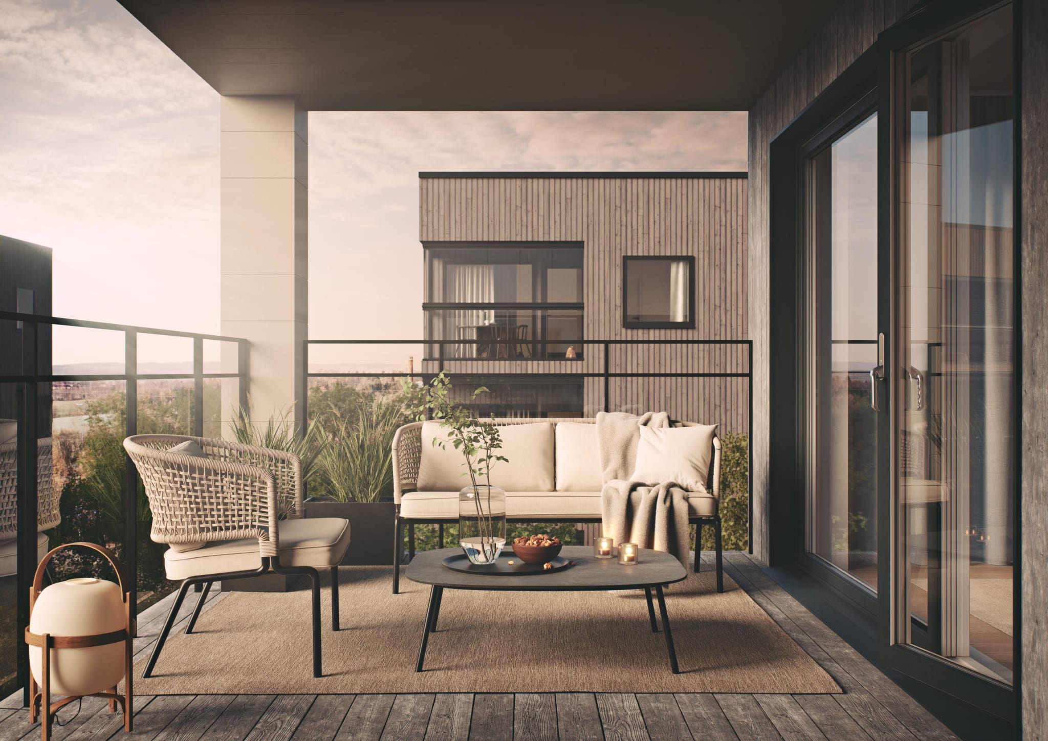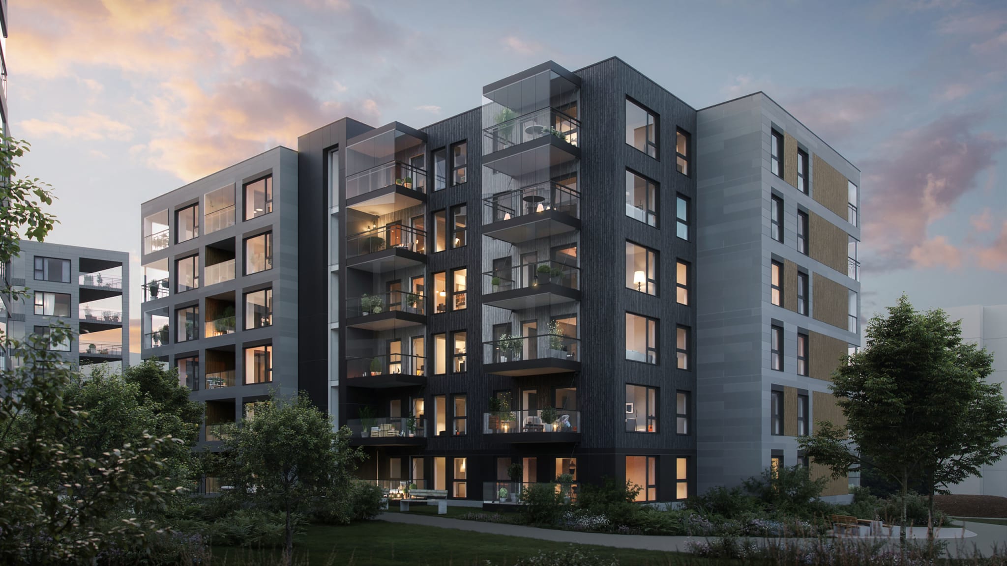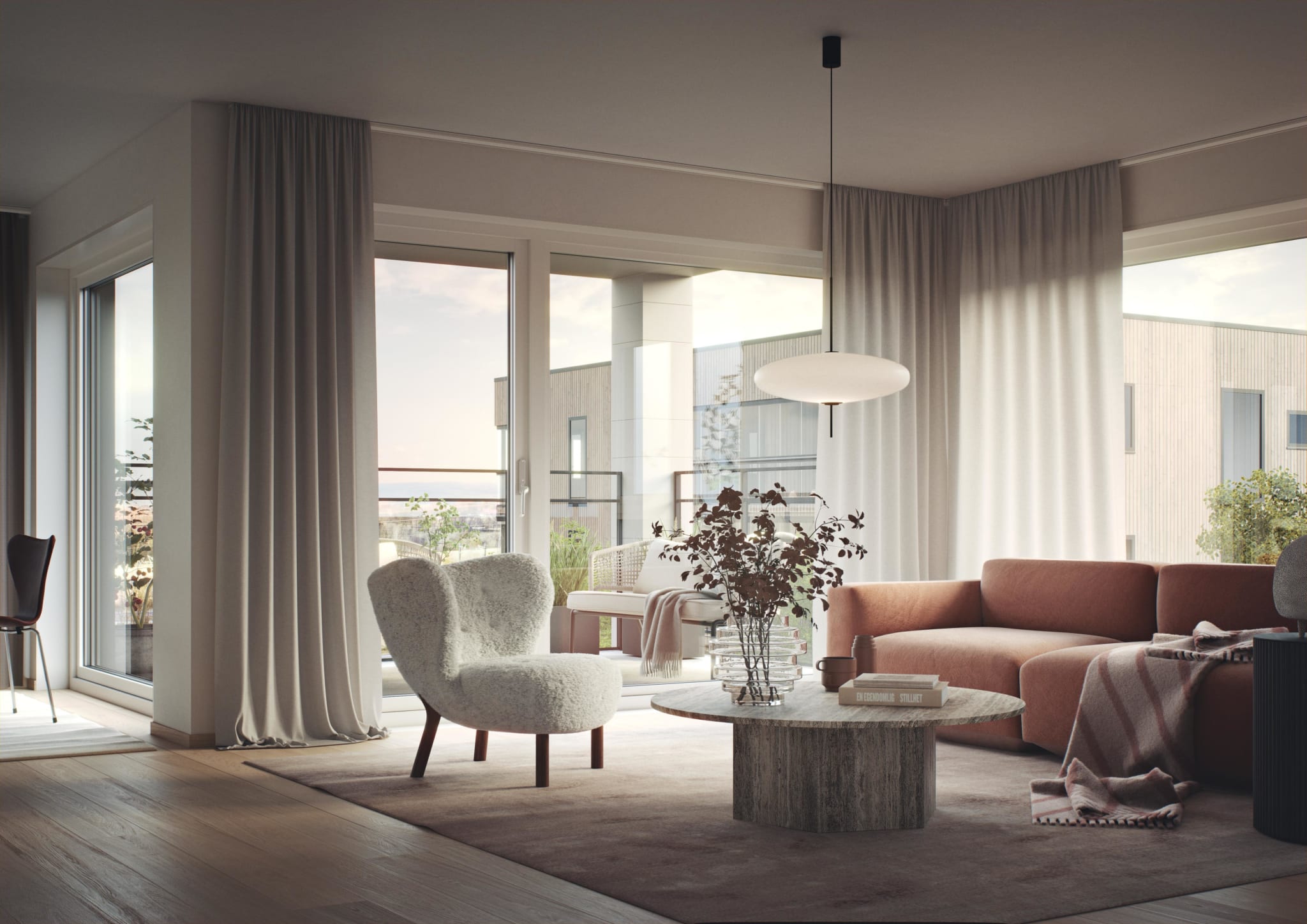 Standard leveranse på Vesthagen er et hvitt moderne kjøkken med håndtak i rustfritt stål på over- og underskap. Den mørke grå benkeplaten står i fin kontrast til det lyse kjøkkenet. På gulvet er det 3-stavs eikeparkett i en lyspigmentert farge. Fargevalgene går fra hvitt til varmere toner, for å myke opp og tilføre varme. Dette konseptet skaper et fint utgangspunkt og en god ramme for å tilpasse din personlige stil.