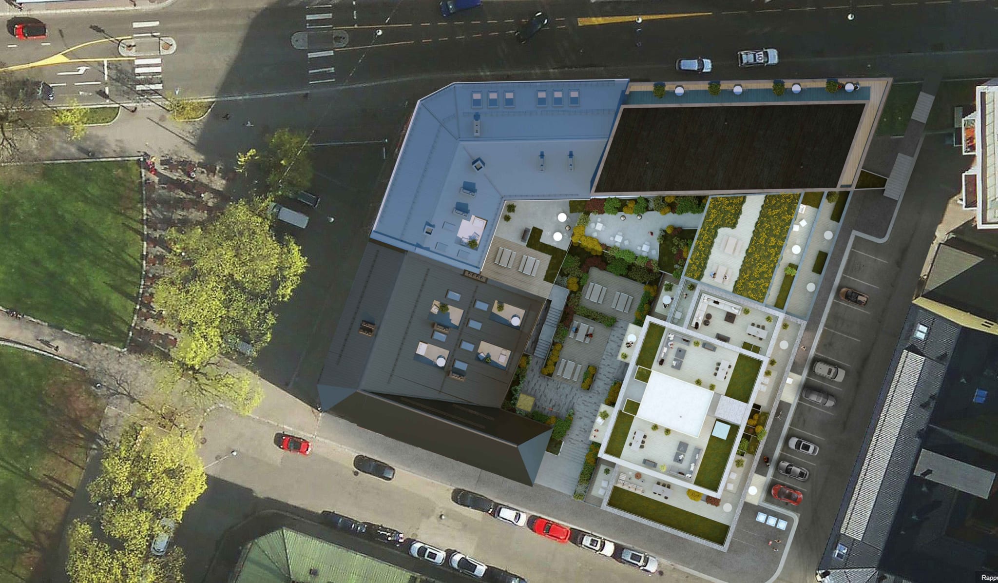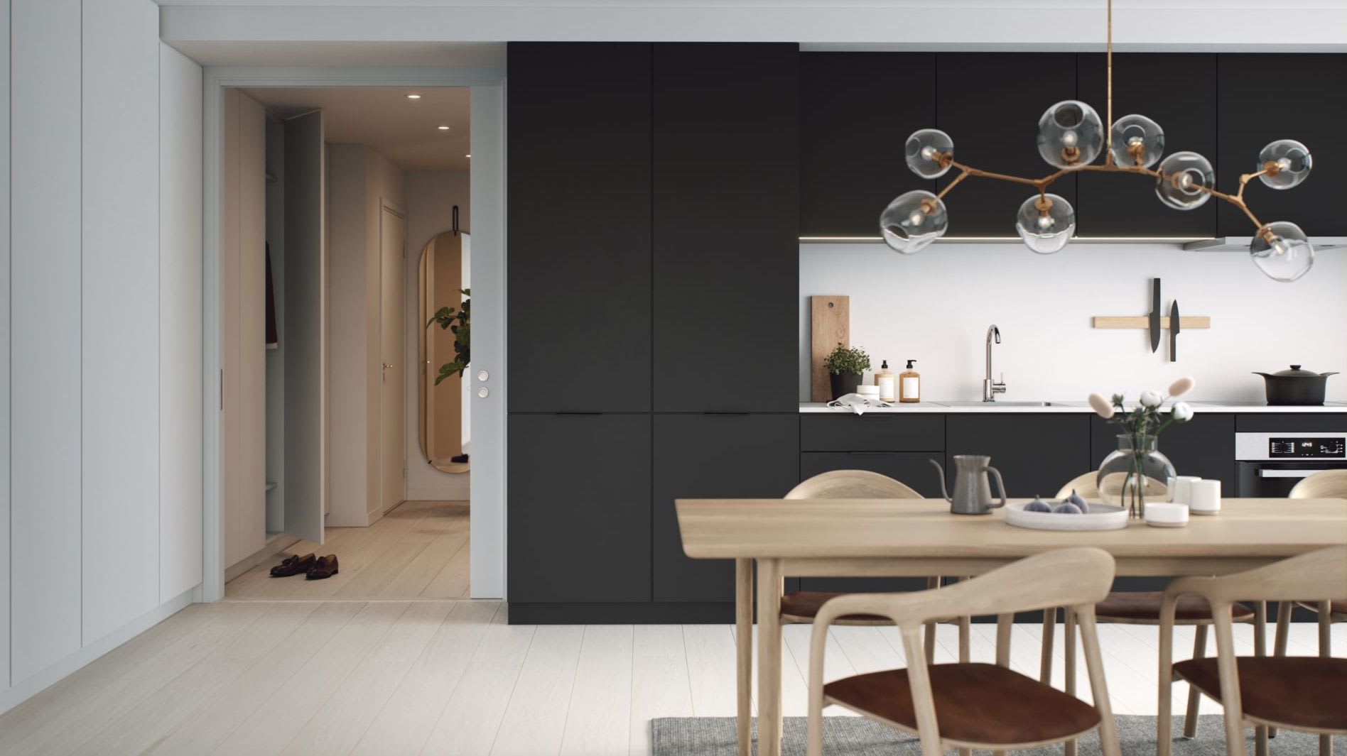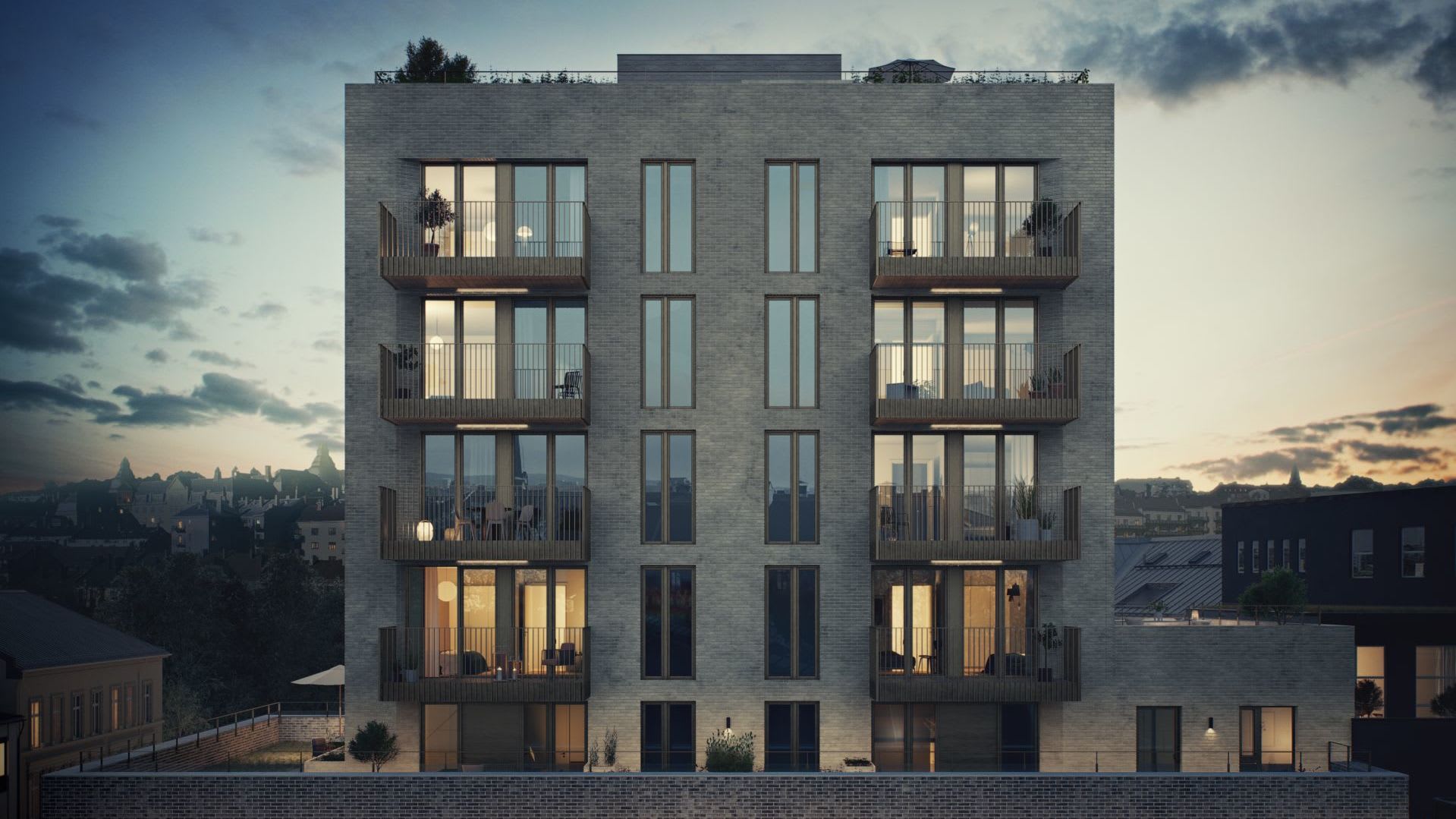 Bygget får en base bestående av 6 leiligheter pr. plan fra 2. til 5. etasje, 3 leiligheter i 6. etasje med flotte takterrasser og et, slankt tårn som strekker seg fra 7. til 10. etasje bestående av 2 romslige leiligheter i hver etasje. I 7. etasje får en av leilighetene en flott takterrasse og leilighetene i 10. etasje har trapp opp til hver sin private takterrasse med praktfull utsikt over byen. 4 leiligheter i 2. etasje får franske balkonger mot gårdsrom, alle øvrige leilighetene får gode uteareal, enten i form av balkonger eller store, flotte terrasser. De fleste vender mot vest. Leilighetene får god takhøyde på over 2,50, noe som gir en meget god romfølelse. Dette i kombinasjon med store vindusflater, foldedører eller gode skyvedørsfelt mot vest, gir leilighetene meget gode bokvaliteter. Der leilighetene har store foldedørsfelt mot balkonger inkluderes utearealet i leilighetens oppholdsareal på en helt unik måte. Leilighetene får et moderne uttrykk og meget god standard på innvendige flater. Det leveres store kvalitetsfliser på bad, lys enstavs parkett på gulv og svart kjøkkeninnredning fra Mobalpa av høy kvalitet, som skaper en fin kontrast i de lyse rommene.
